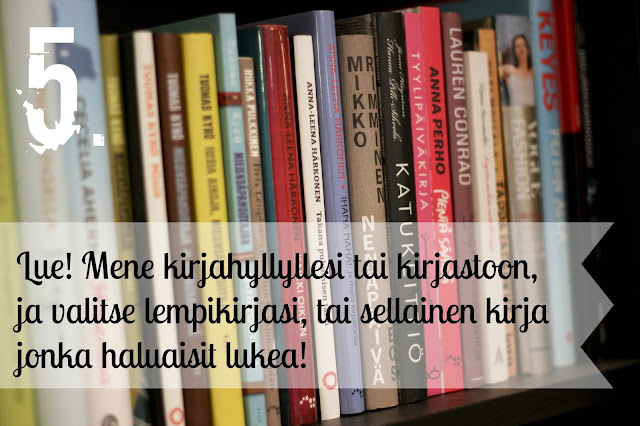 Lukeminen on sellainen harrastus, joka on ollut mulle tärkeä ihan pienestä asti. Harmittavan vähän ehtii nykyään lukemaan, mutta kyllä mulla koko ajan on vähintään yksi kirja kesken (se vaan etenee sit vähän hitaammin kuin aiemmin...). En usko olevani ainoa, jonka tekisi mieli lukea enemmän kuin mitä ehtii - joten tänään kehotankin sinua menemään kirjahyllyllesi tai kirjastoon, ja ota joku kirja taas luettavaksesi. Se voi olla lempikirjasi jonka pariin aina palaat, tai joku sellainen jonka haluaisit lukea muttet ole vielä ehtinyt. :) Lue edes pari sivua tai yksi luku jos enempään ei ole aikaa - taatusti tulee hyvä mieli. :)